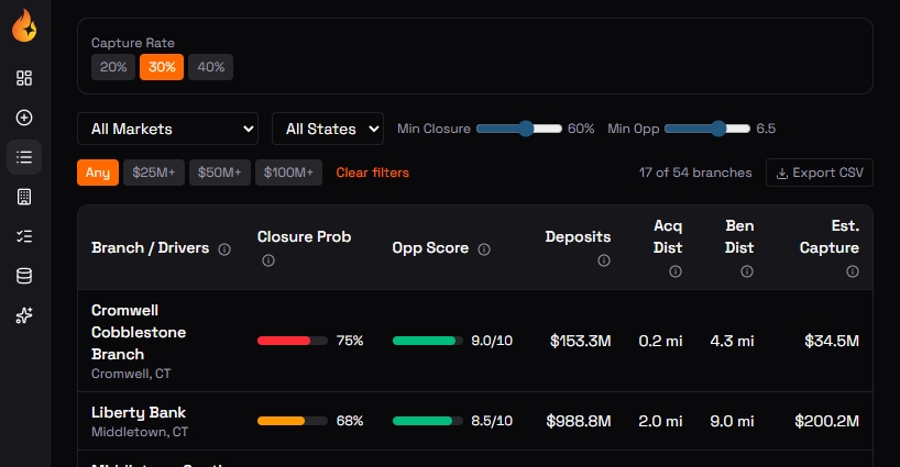 Every competing institution sees the same merger headline. MergerIQ tells you exactly where the opportunity is — branch by branch, market by market, borrower by borrower.
